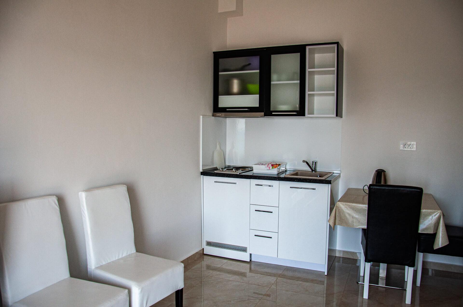 7 номеров — квартиры-студии со своей кухней и с/у. Сдаются в сезон по цене 80 евро/сутки.