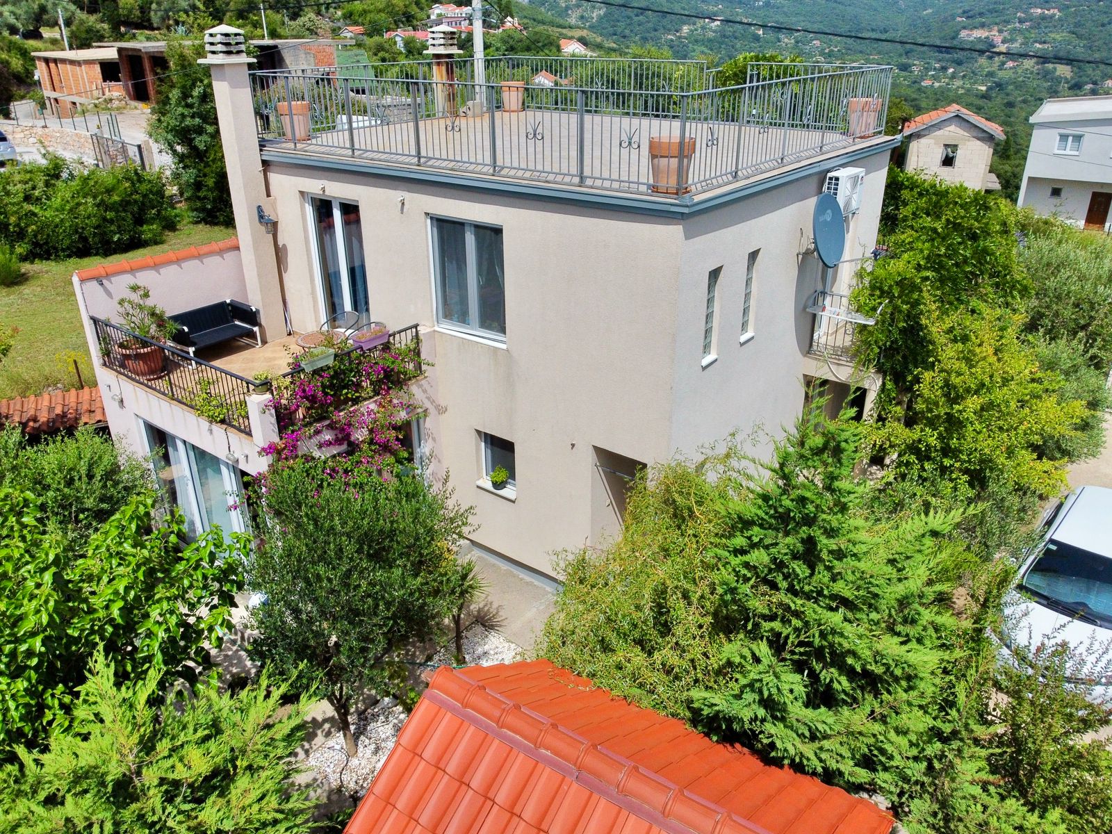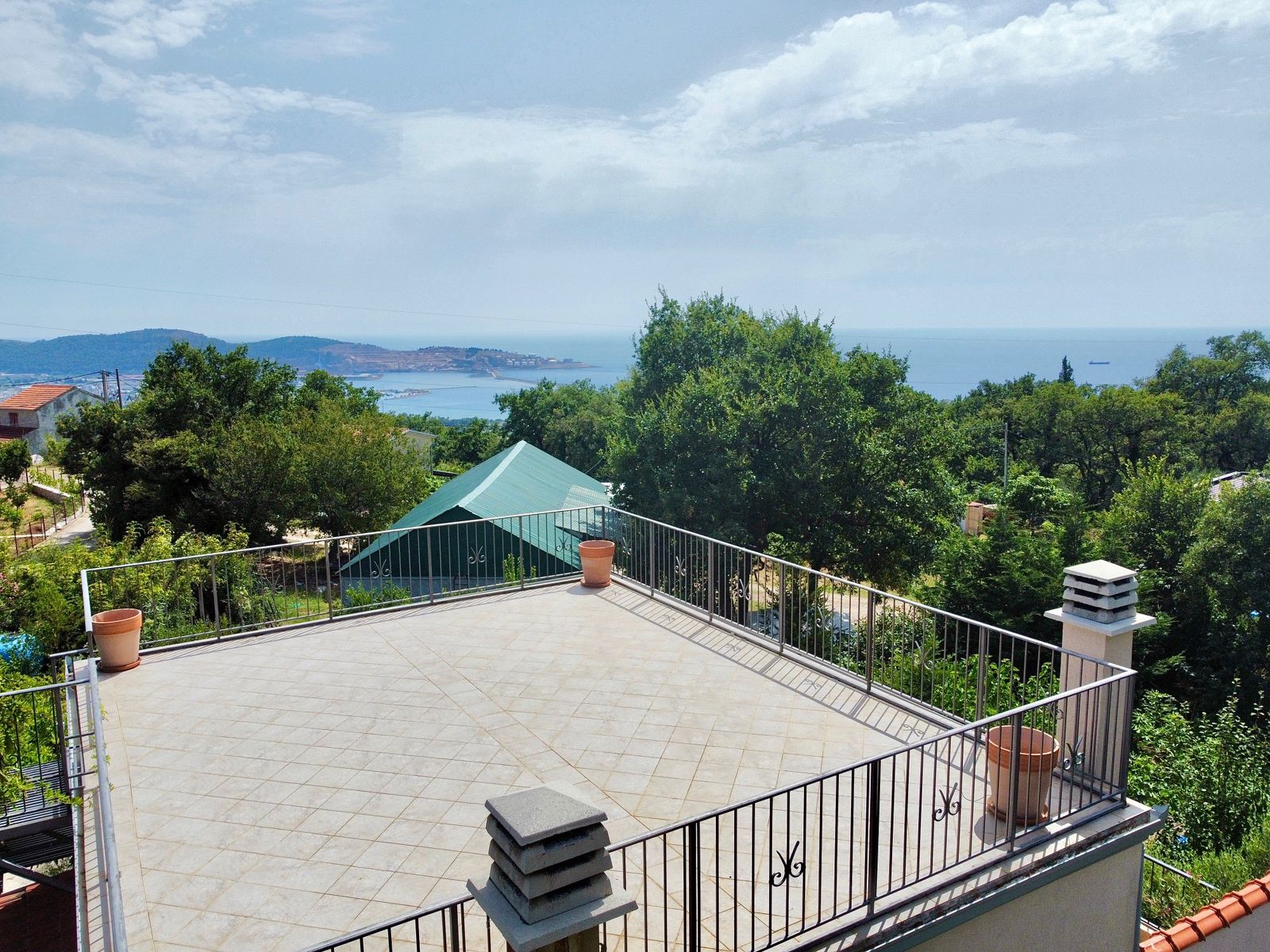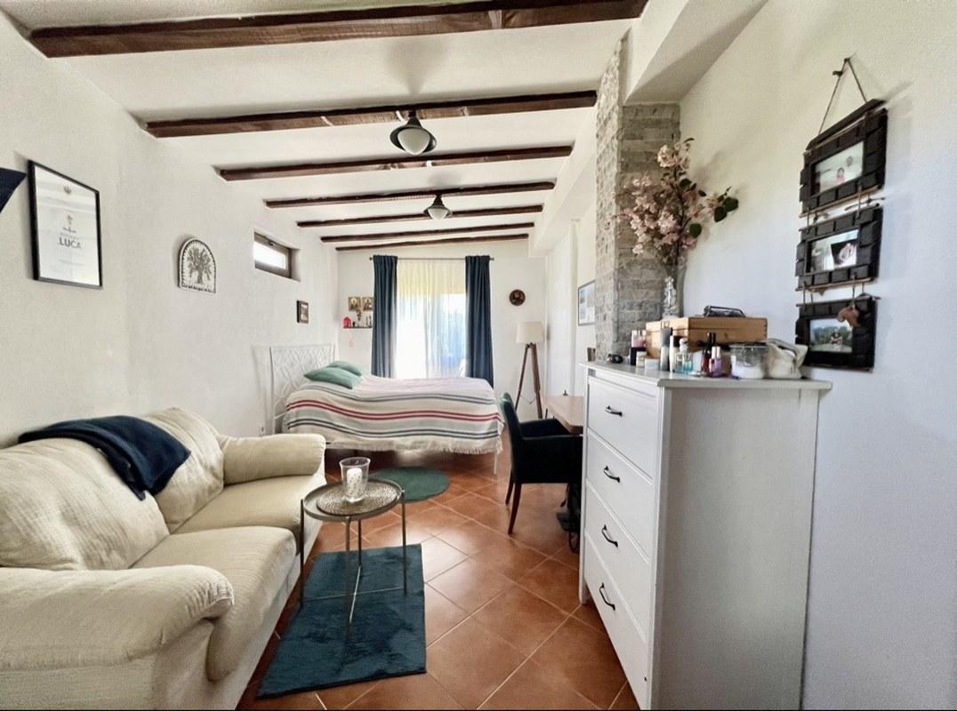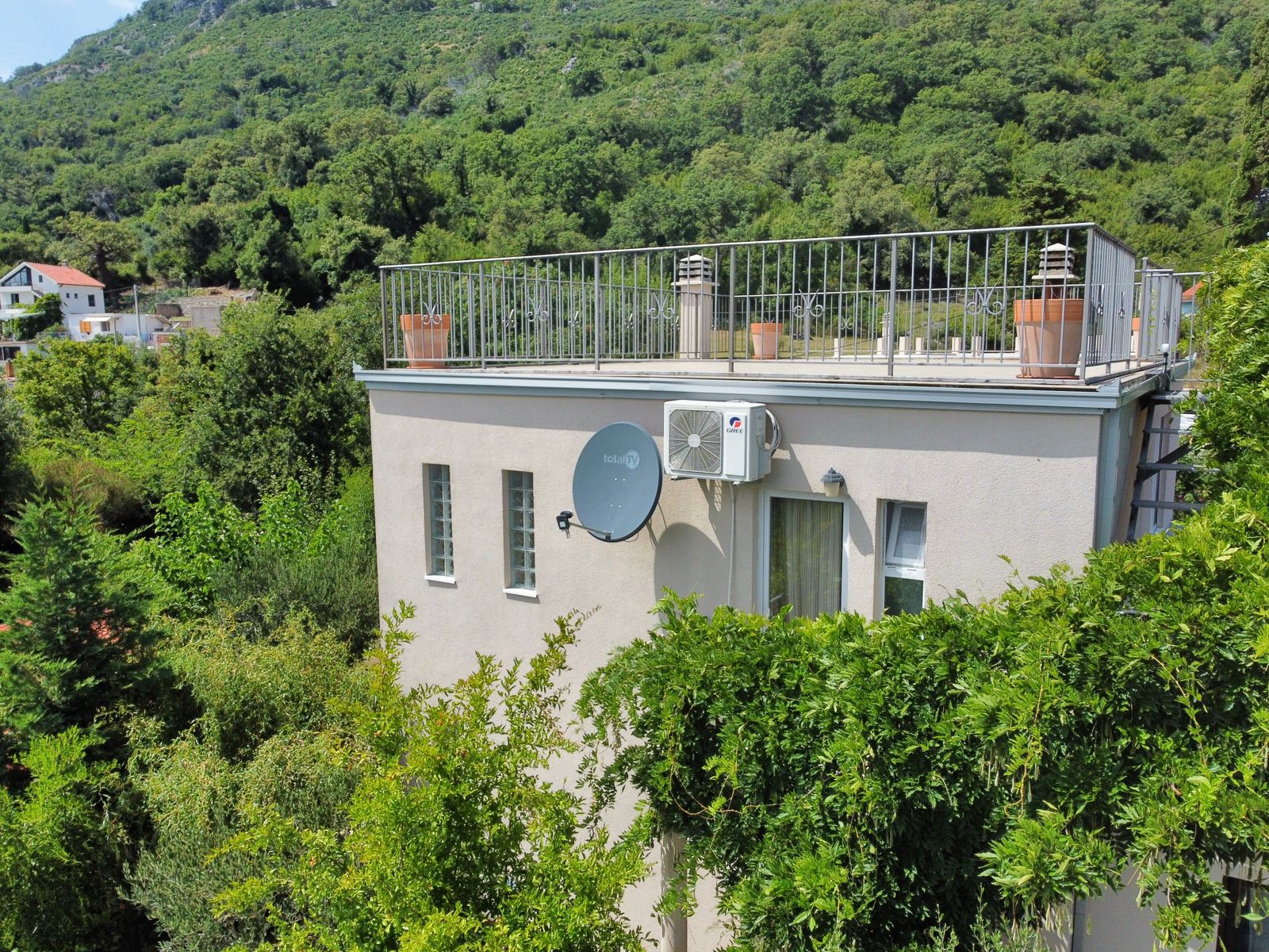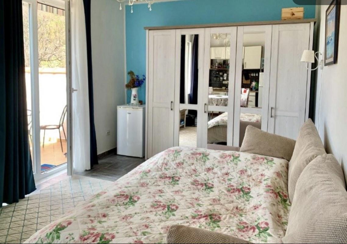 — Второй этаж : Имеет отдельный вход и представляет собой автономную квартиру. Здесь расположены спальня, гостиная с кухней, санузел с ванной-джакузи, а также открытая терраса и отдельный балкон. С балкона можно подняться на плоскую крышу, откуда открывается захватывающий вид на море и горы — идеальное место для занятий йогой или принятия солнечных ванн.