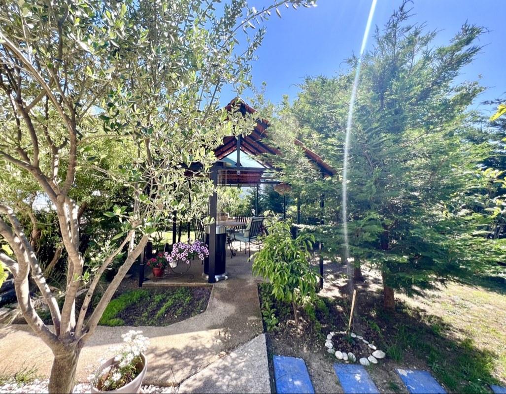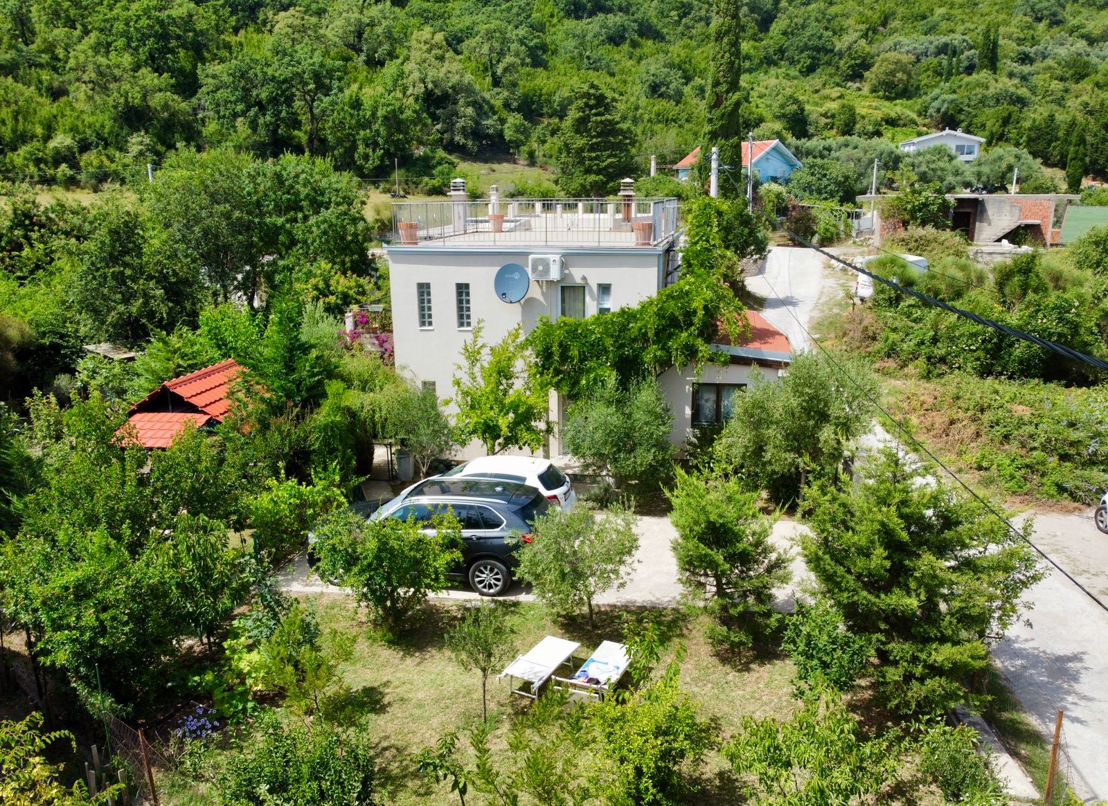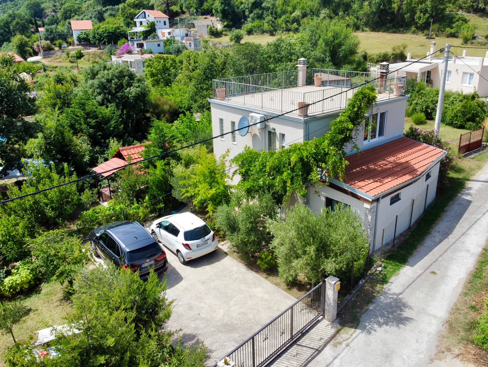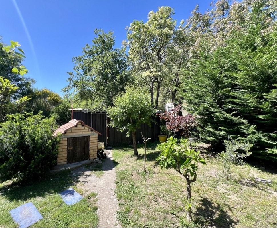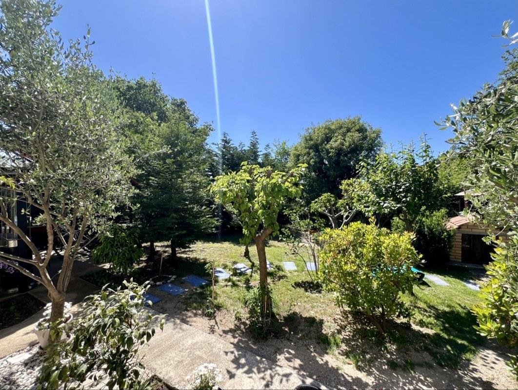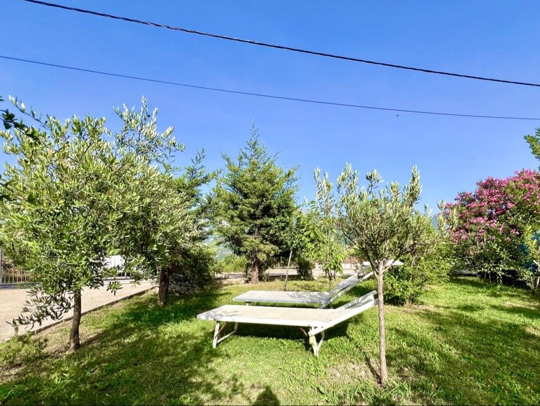 На участке растут разнообразные фруктовые деревья, оливы, декоративные деревья и кусты, создавая атмосферу сада и уюта. Большой паркинг на четыре автомобиля оборудован воротами на дистанционном управлении, что обеспечивает безопасность и удобство. Для любителей барбекю предусмотрено крытое место для приготовления пищи на свежем воздухе, а также отдельно стоящая хозяйственная постройка.