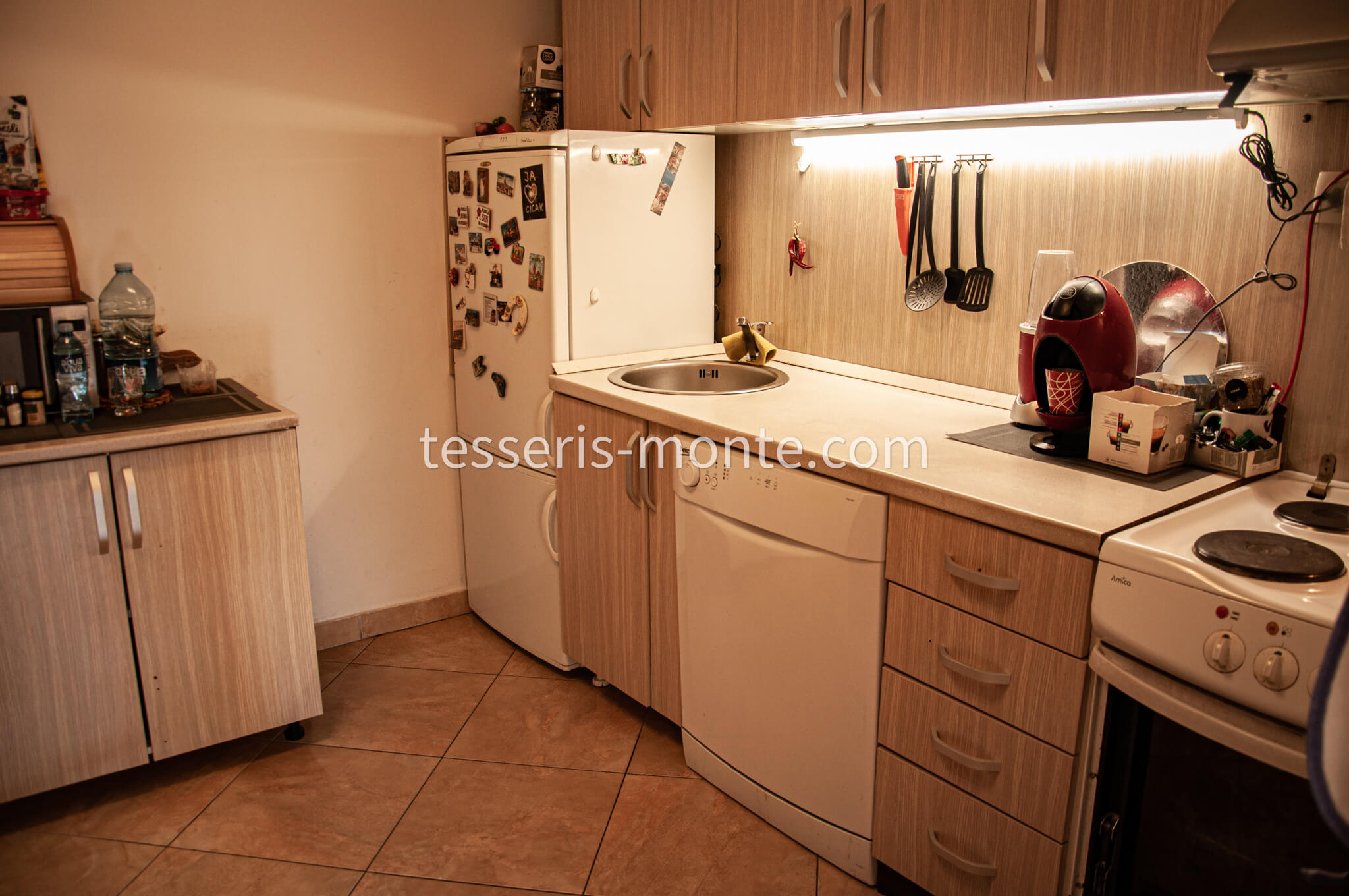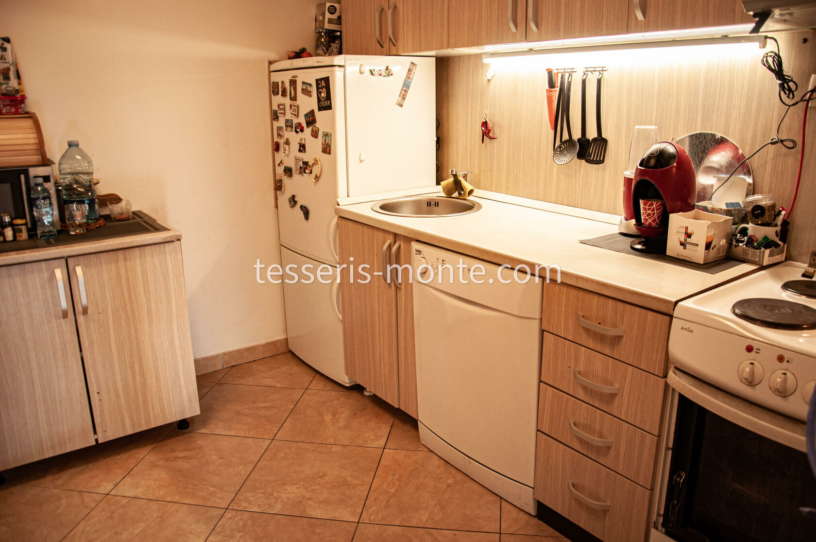Кухня отделена от гостиной перегородкой. Установлена вся необходимая кухонная техника, в том числе и посудомоечная машина.