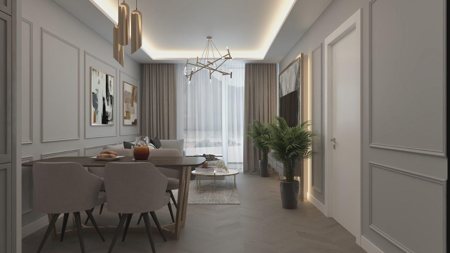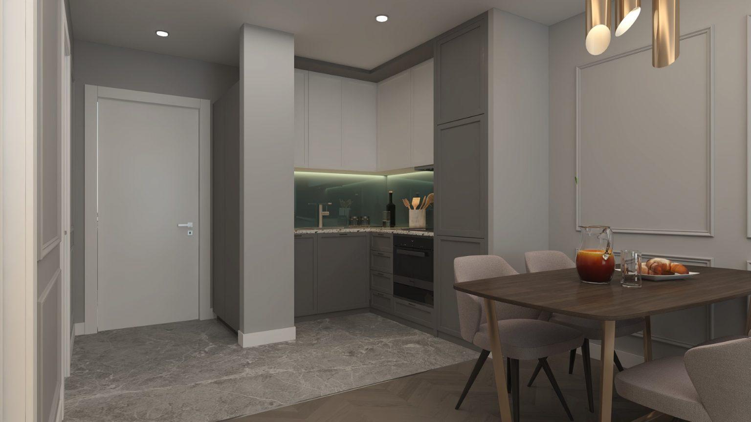 Современный интерьер включает полностью оборудованную кухню и удобную трапезарию, идеальное место для приема гостей или ужина вдвоем.