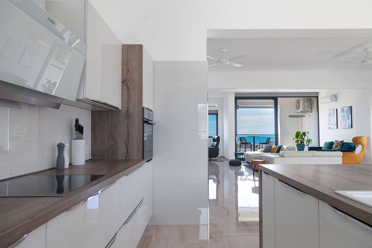 Уютной просторной гостиной объединенной с кухней, двух спален, двух ванных комнат, коридора со встроенным шкафом и двух террас.