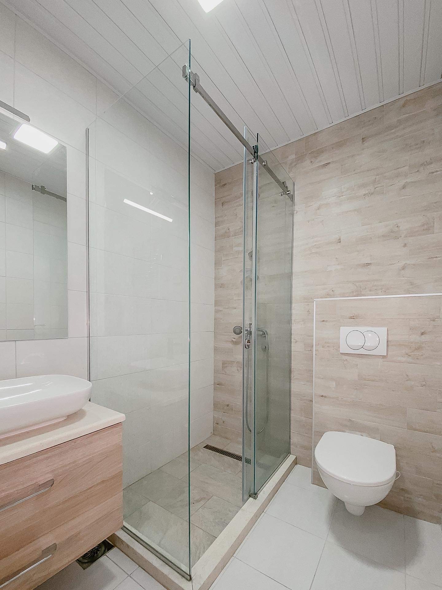 Полностью сделанная современная ванная комната с душевой кабиной