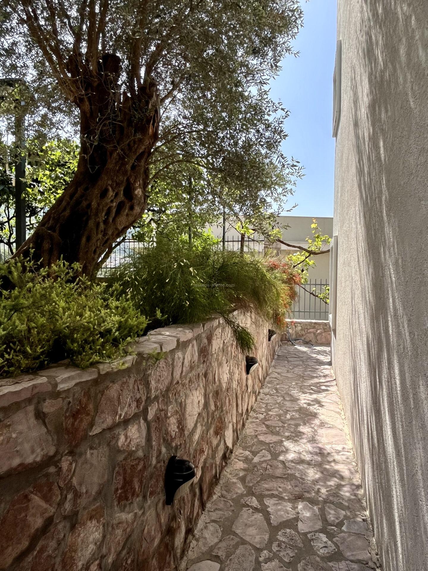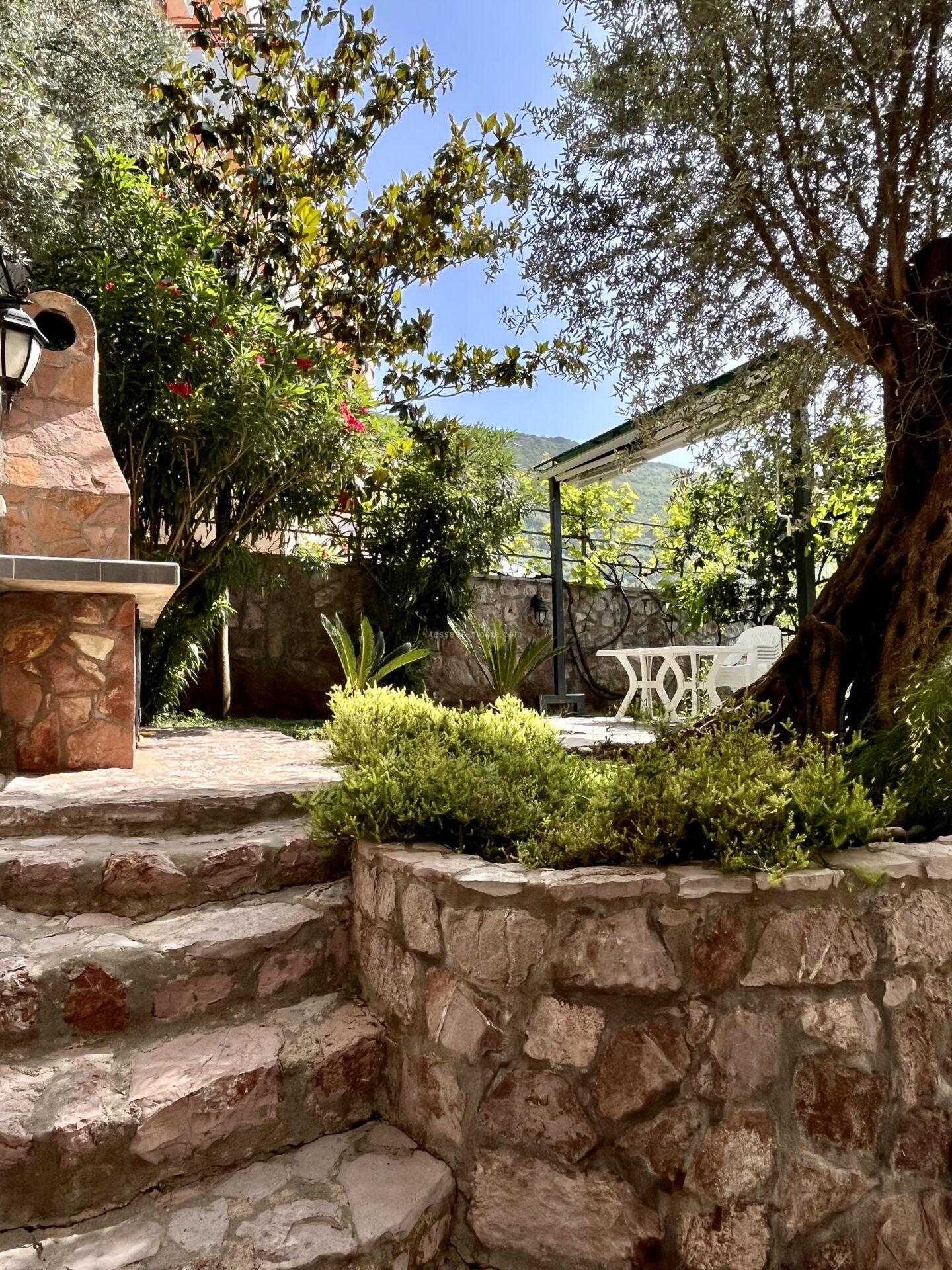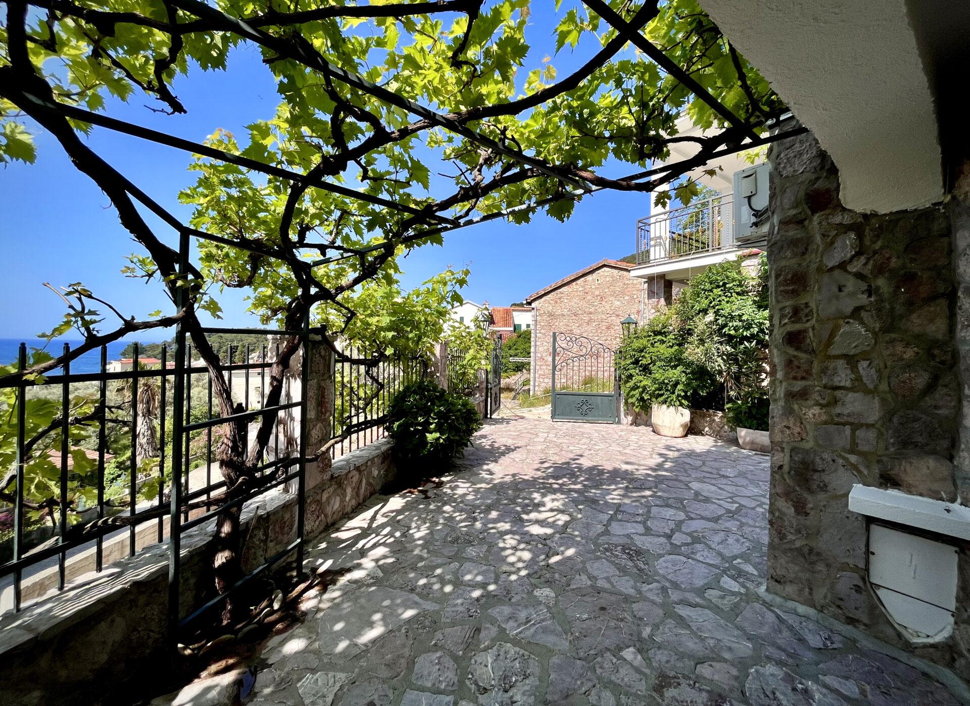 Придомовая территория, вымощенная натуральным камнем, с видом на море и горы