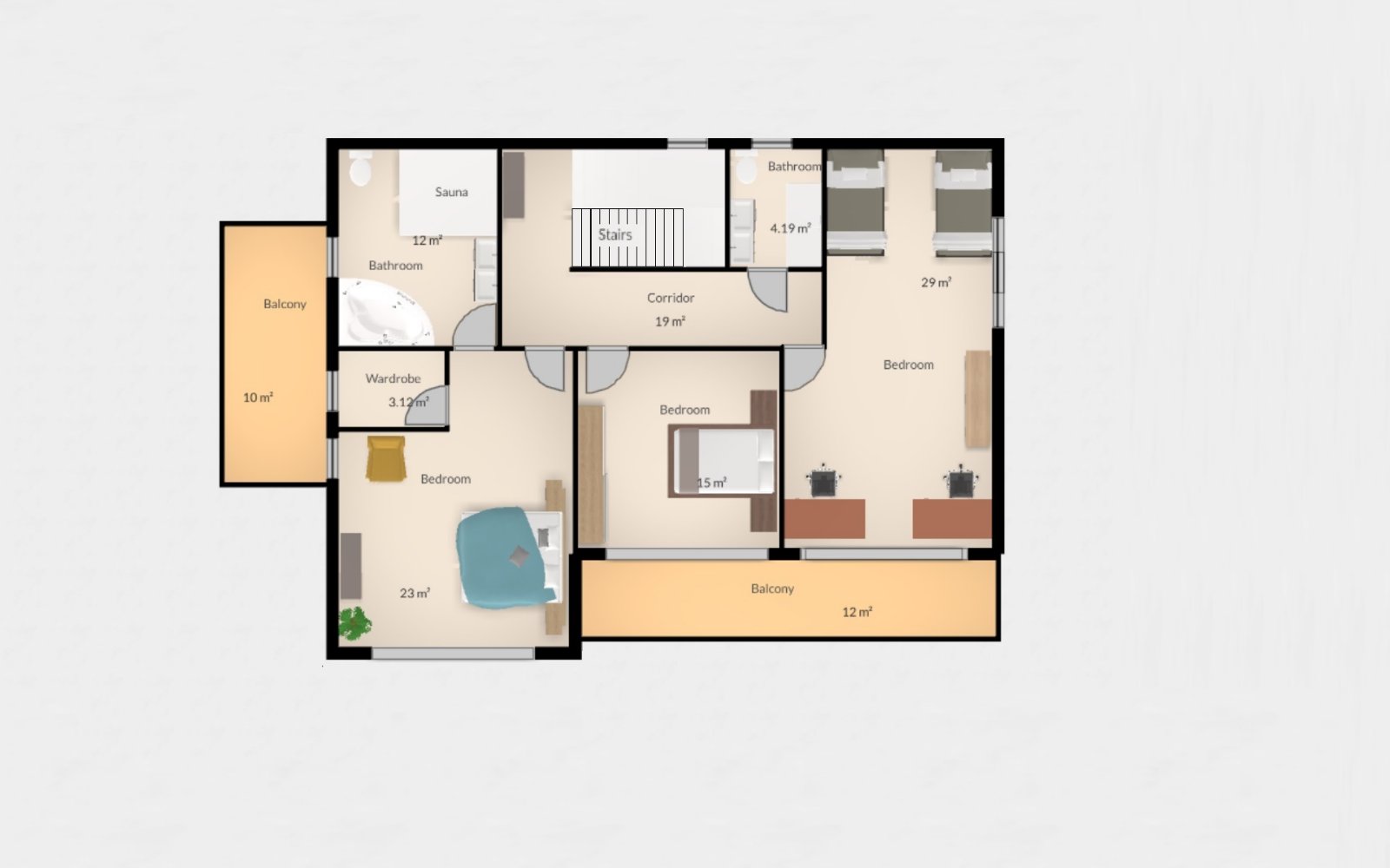В хозяйской спальне своя гардеробная, свой санузел с сауной и с отдельным балконом с видом на закаты над морем.