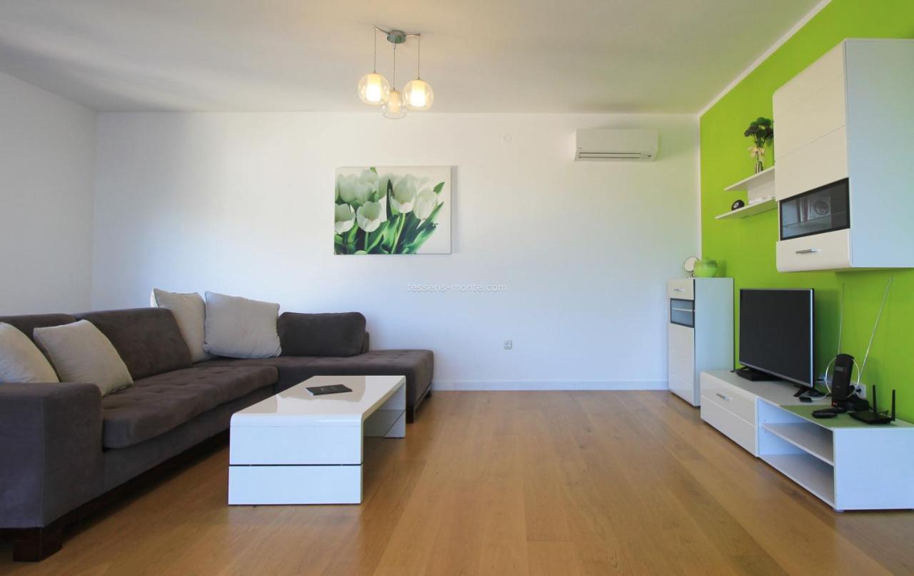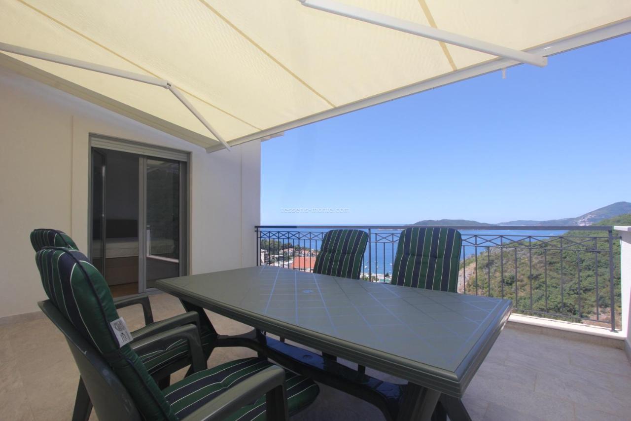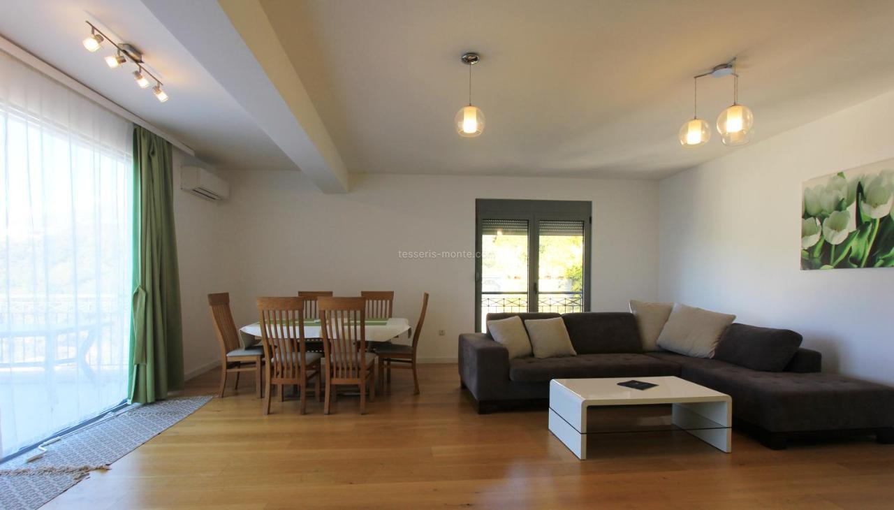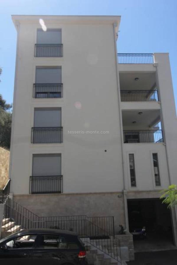 Укупне површине 110м2 састоји се од две спаваће собе, два купатила, дневног боравка, опремљене кухиње са машином за прање судова и рерном, балкона и приватног гаражног места. Нова модерна кућа. Са терасе се пружа прекрасан панорамски поглед на море и планине.