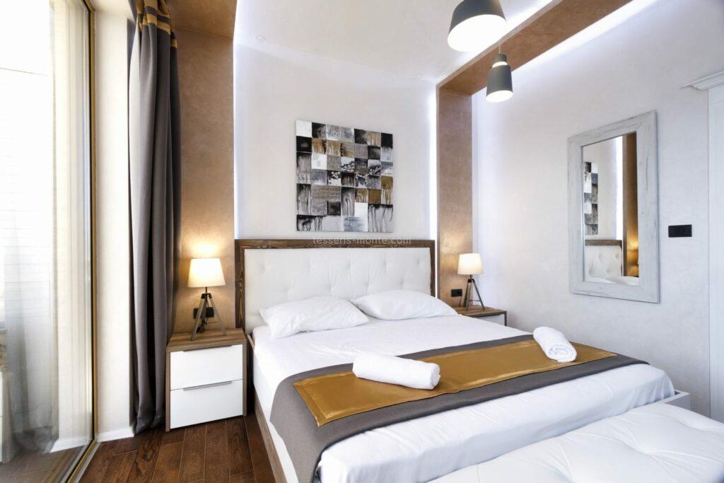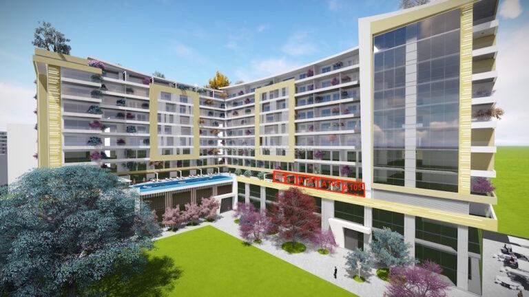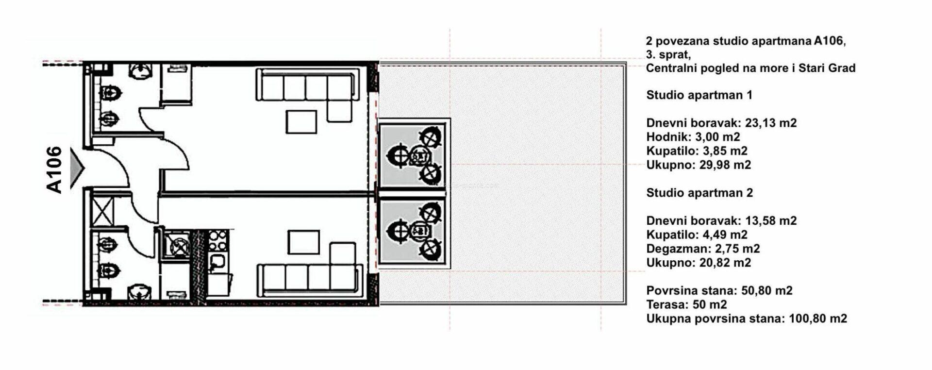 Пропонуємо дві суміжні студії A105 (106, 107) на 3-му поверсі, житлова площа 50.80 м² + 50 м² тераса (загальна площа 100.80 м²). Кожна квартира складається з двох студій з двома входами, двома ванними кімнатами, спальними зонами та терасами з видом на море та Старе місто.