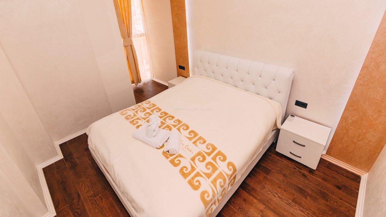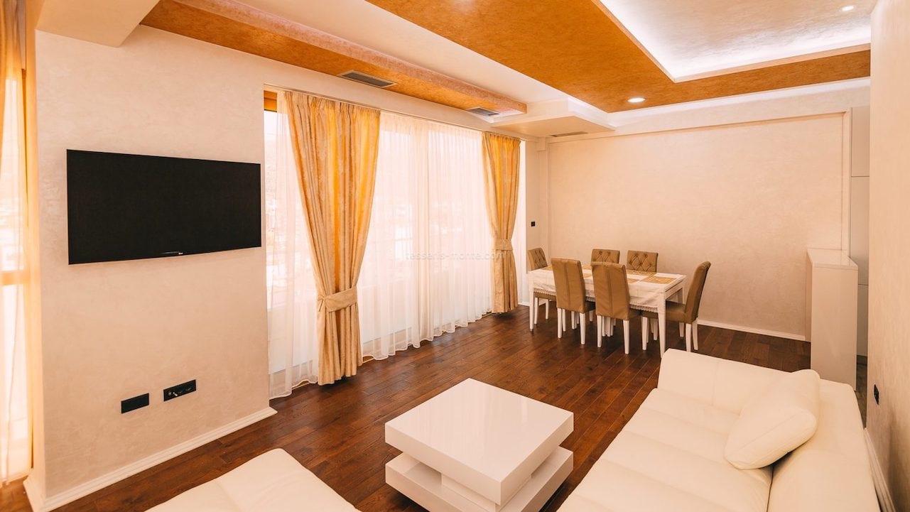 Двокімнатна квартира площею 75 кв.м у центрі Будви. Квартира просторою вітальнею, столовою зоною, двома спальнями, однією ванною кімнатою, підсобним приміщенням, а також терасою з видом на море.