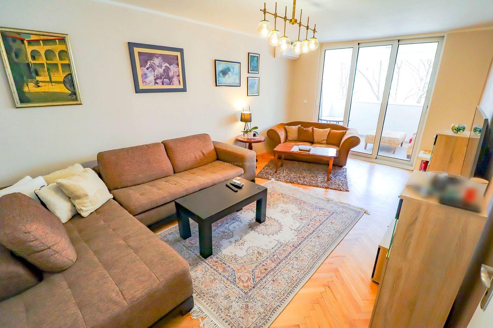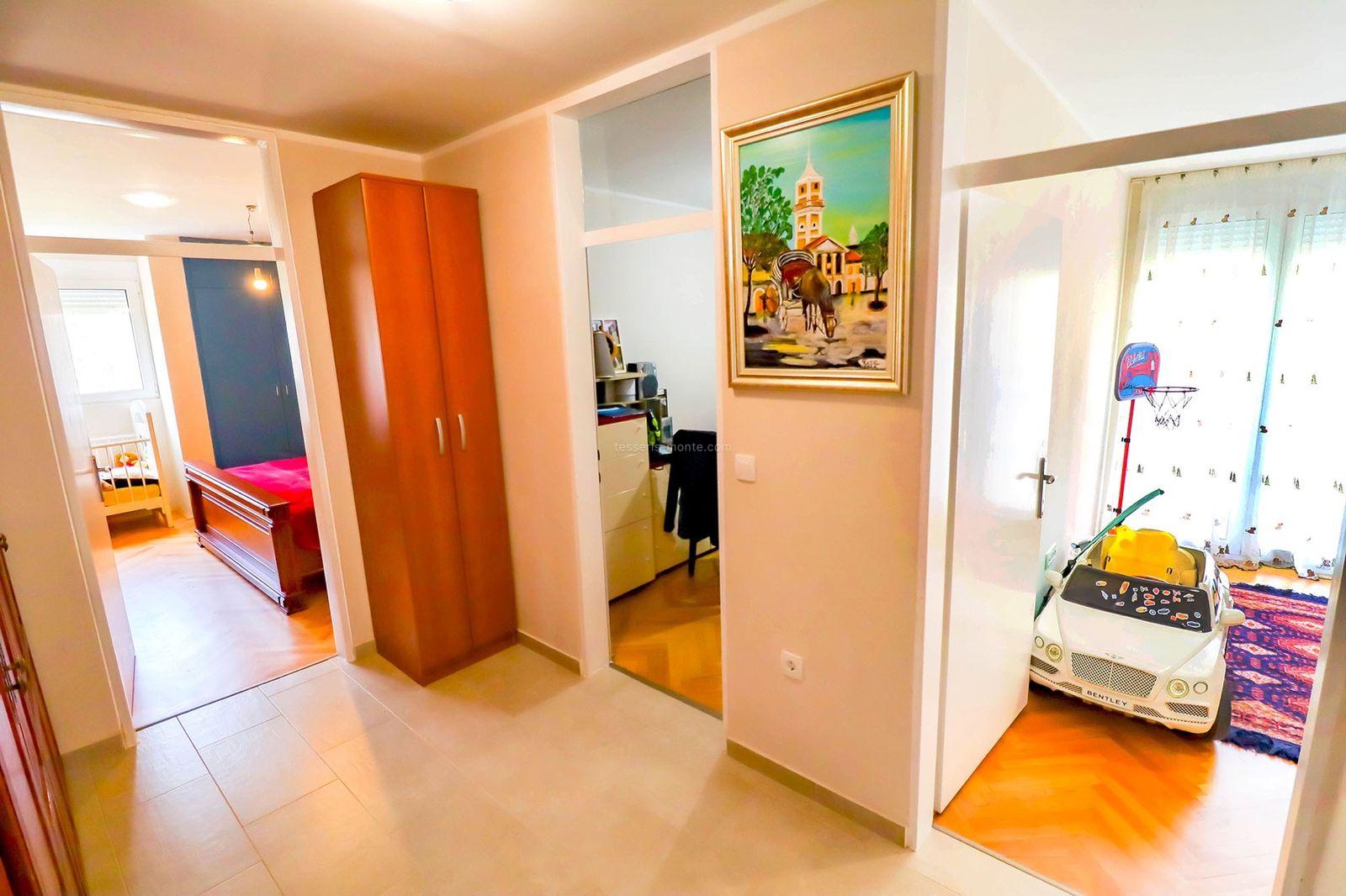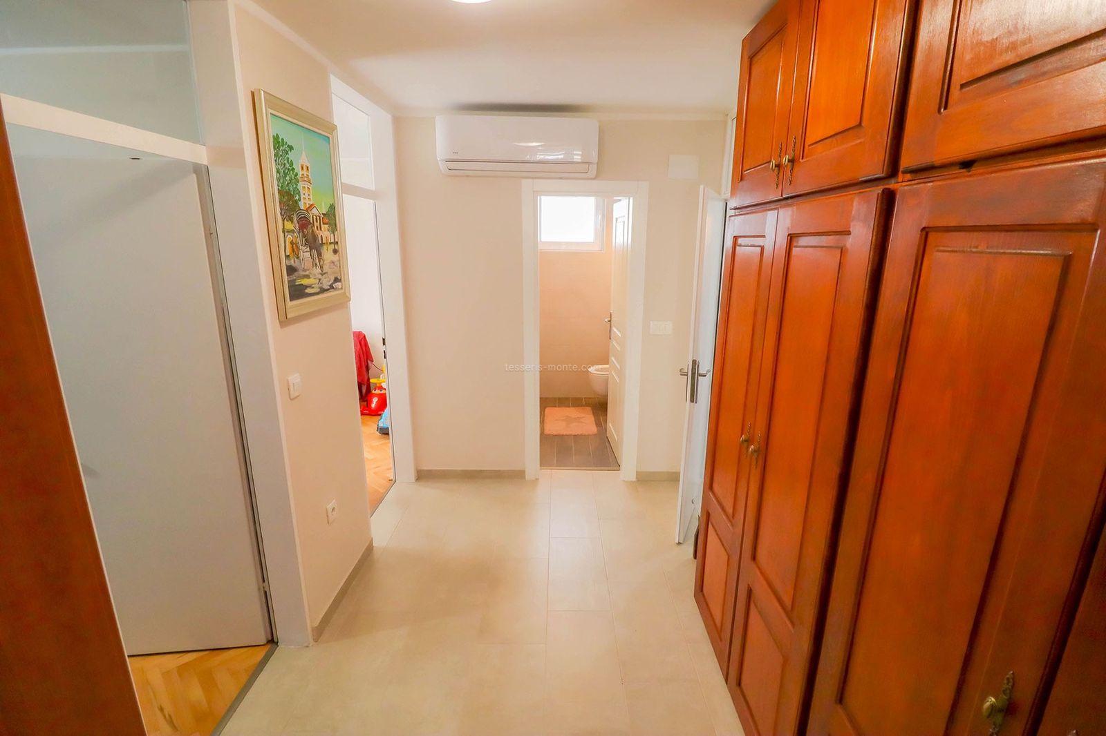 Квартира зі свіжим ремонтом знаходиться на другому (першому чорногорському) поверсі п'ятиповерхової будівлі з ліфтом. Фасад будівлі оновлено у вересні 2022 року. Квартира орієнтована на захід, у бік моря. У квартирі встановлено нові-профілі Alumil, фурнітура Stublina з москітними сітками та алюмінієві жалюзі. Відеоспостереження через Wi-Fi перед вхідними дверима. Глухі двері MePro із подвійним замком. У ході ремонту було замінено всю електрику та сантехніку. По всій квартирі встановлена першокласна гранітна кераміка. Нові змішувачі та вбудовані бачки. Сантехніка Roca та бойлери Ariston. Скло та мармур в обох ванних кімнатах. У всій квартирі струганий та лакований паркет. Інверторні кондиціонери Wi-Fi А+++. Шафи із пропареного бука. Вбудовані шафи Mediapan. За документами площа квартири 89 м2, а реальна площа 105 м2 + 7 м2 загальної тераси, яка за документами належить квартирі. Коли будівлю було збудовано, тераси не вписувалися у квадратні метри квартири.